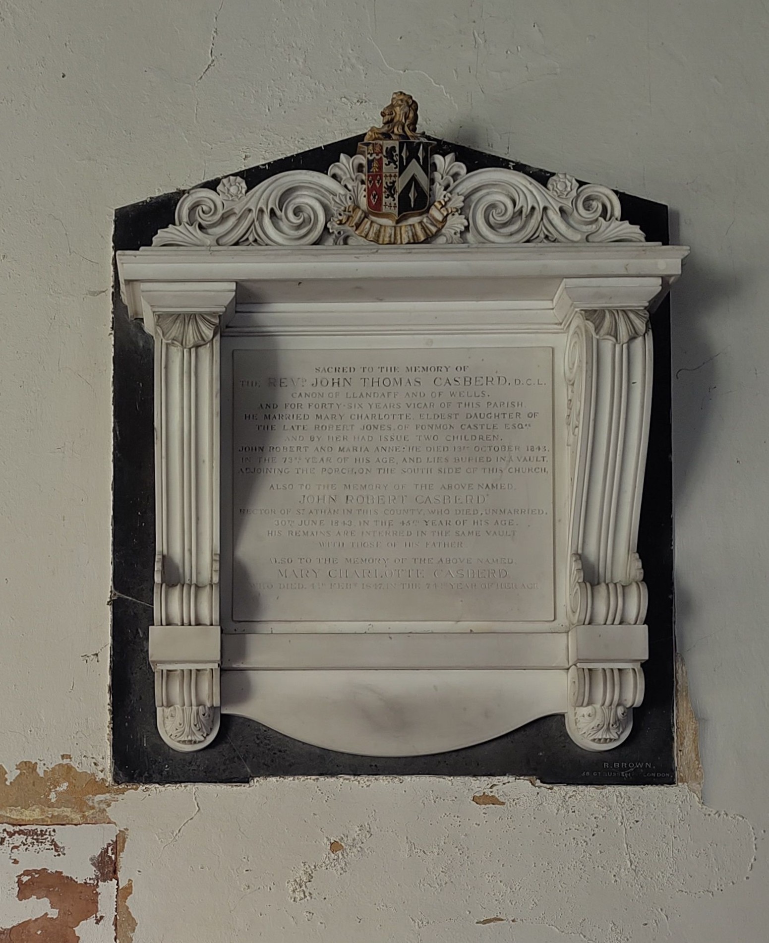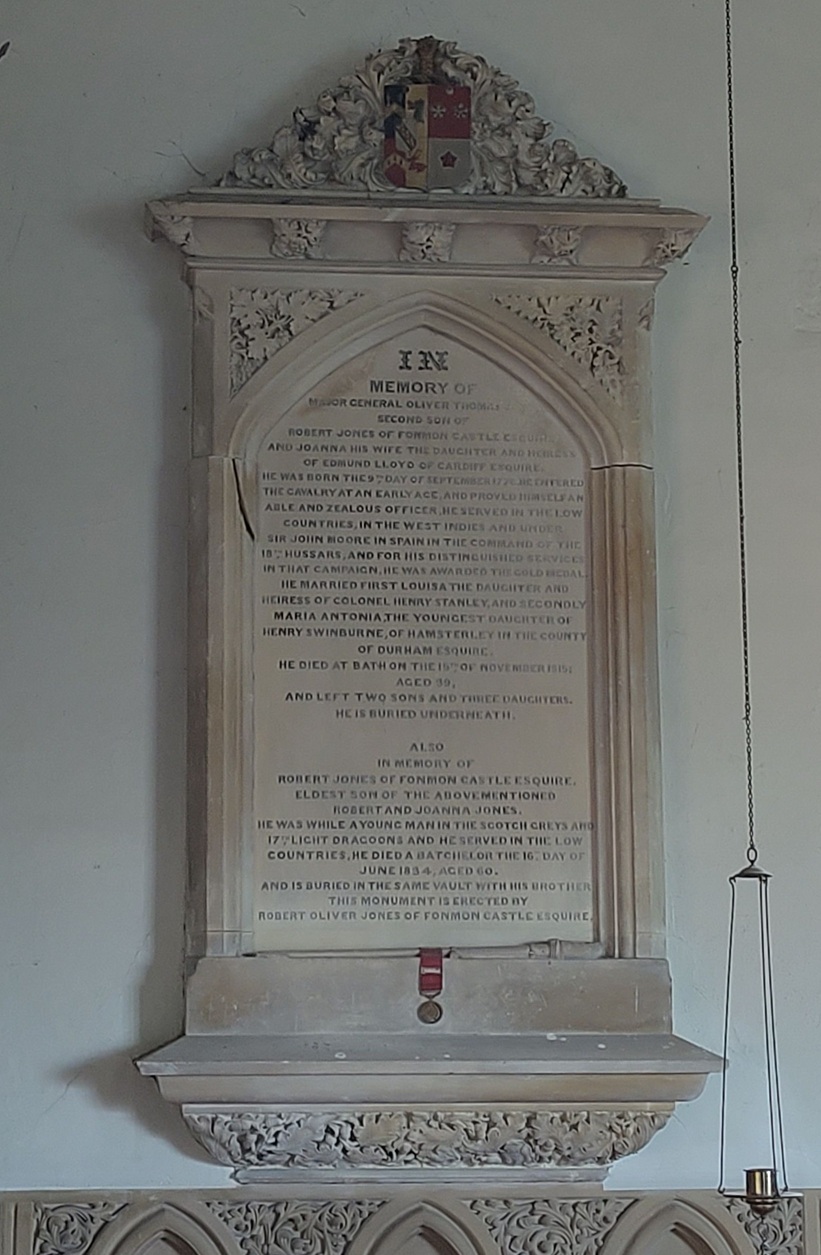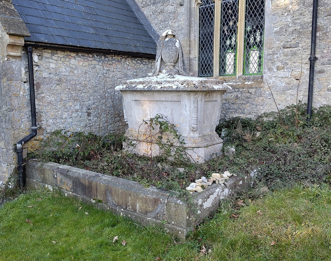 Then there were the arrangements for the funeral itself. There was a subtle gradation of gifts of clothing: silk scarves for gentlemen, grey beaver gloves for the labourers and the tenants’ wives and daughters, silk bands for servants and postboys. Gentlemen probably accumulated a number of black silk scarves and gloves from family funerals, but for the tenants’ wives these would have been prized possessions and would have served as reminders of the late lady of Fonmon. The minister, John Casberd, received 2 guineas and an Italian crepe scarf. It is perhaps surprising that he was not given anything more elaborate, since he was a member of the family: he had married Joanna and Robert’s daughter Maria Charlotte. A rather controversial figure, he was criticised for his inability to speak Welsh in a parish where that was the only language many of his congregation used. He was a pluralist, being vicar of Llantwit Major and Llysworney and a canon of both Llandaff and Wells. His interests were not local, and he left generous benefactions to his old college, St John’s college, Oxford, where the Casberd Scholarships are still offered to students. Nevertheless, he was buried in the Jones family vault at Penmark: there is a monument to him in the church (fig.2 below) and a tomb chest on the vault (fig. 3).